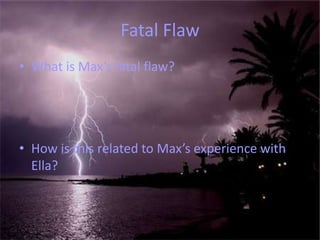 Max has a fatal flaw related to her experience with Ella. There is irony in Ella's mom's profession, which is why Max felt comfortable with her. Jeb was trying to do something with Angel on page 140 that was a turning point for the Flock. Max was emotionally rejuvenated from her visit with Ella and her mom despite being told to think with her brain, not her emotions.