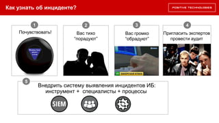 Документ описывает систему Maxpatrol SIEM для выявления инцидентов информационной безопасности в реальном времени, выделяя необходимость анализа больших объемов данных и унифицированного подхода к инцидентам. Проблемы внедрения SIEM включают недостаточную эффективность, высокие затраты на персонал и большое количество ложных срабатываний. Также рассматриваются решения и преимущества платформы Maxpatrol для управления активами и уязвимостями в IT-инфраструктуре.