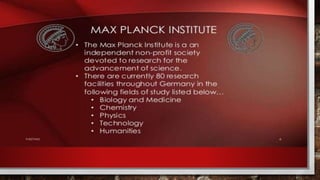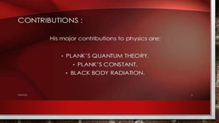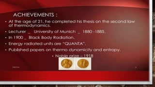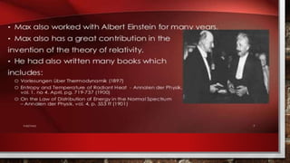This presentation compares Max Planck, a famous German physicist and mathematician, to the presenter themselves. It provides biographical details about both Max Planck and the presenter, such as their dates of birth, places of residence, education histories, and current statuses. The presentation also outlines the topics to be discussed, including an introduction, Planck's biography and achievements, and a work outline.
