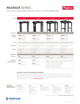 The document summarizes Pentair's MAXRACK series of open frame racks designed for high-density environments. The racks feature integrated cable and thermal management, with cable tie-down points and openings to route cables. They are scalable, versatile racks that can be assembled in under 15 minutes, with load capacity up to 2,500 pounds. Accessories include vertical and horizontal cable managers for optimized airflow and cable organization. The MAXRACK series is a complete, versatile solution for high-density racking applications.
