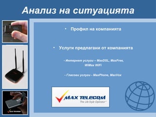 Анализ на ситуациятаПрофил на компанията Услуги предлагани от компанията - Интернет услуги – MaxDSL, MaxFree, WiMax WiFi - Гласови услуги - MaxPhone, MaxVox