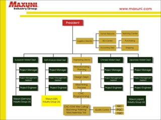 This company presentation provides an overview of Maxuni, a mold manufacturing company with offices in China, Germany, and plans to open an office in North America. It summarizes Maxuni's international team, projects, customers, facilities, equipment, processes, and key metrics such as 2008 sales and employee numbers. Maxuni aims to provide high quality molds for automotive and packaging industries using automated manufacturing systems and international project management.
