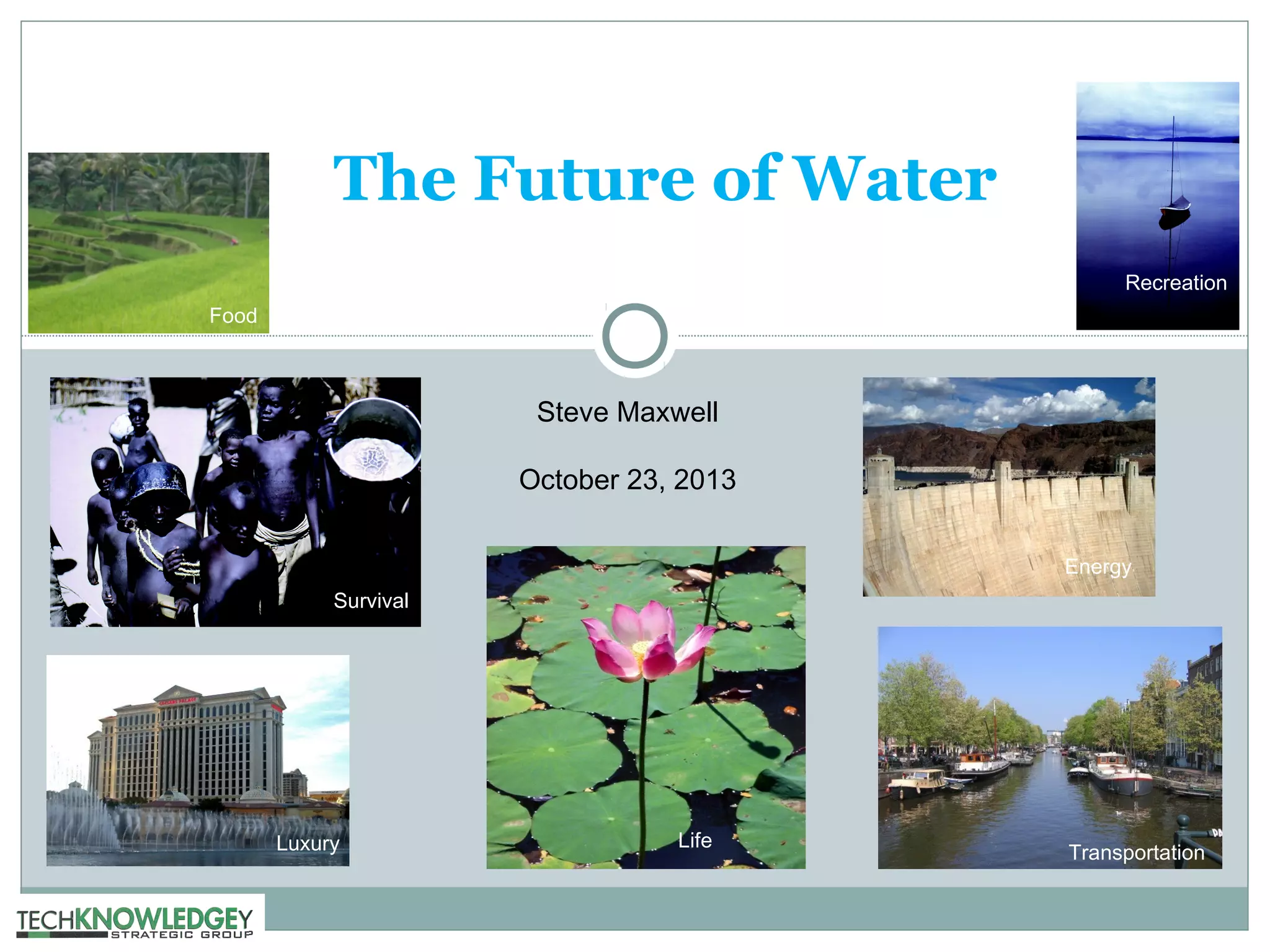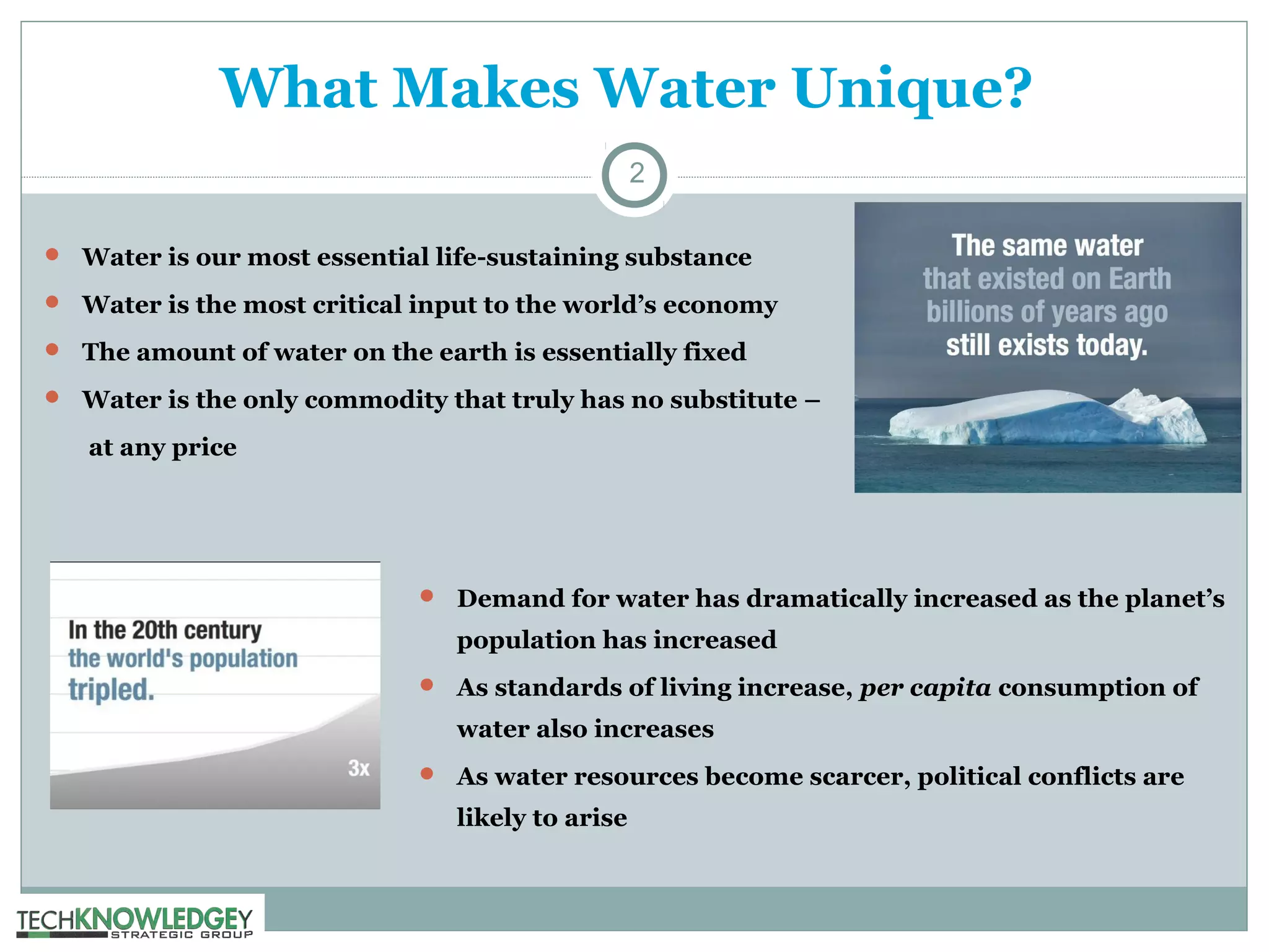 Water is our most essential resource for life, the economy, and has no substitute. However, water demand is increasing with population growth while supply remains fixed. As water becomes scarcer, political conflicts are likely to emerge. Currently, many people live without access to clean water and infrastructure in the US and elsewhere is failing. Climate change will exacerbate water challenges. By 2050, half the world's population may face water stress. Solutions include conservation, reuse, technology advances, and better management of water as a valued resource rather than a right. Water prices will need to rise to reflect its true cost and value to shape sustainable use.