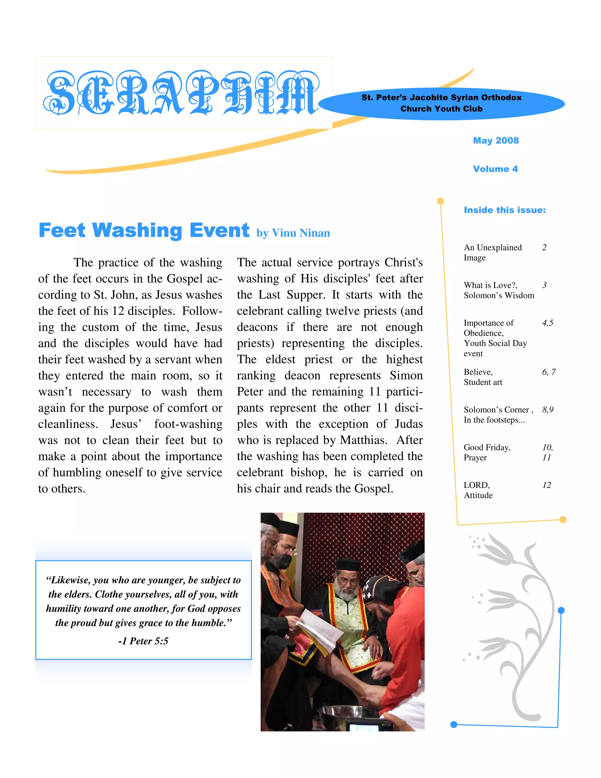 The document provides a summary of the May 2008 issue of the newsletter SERAPHIM from St. Peter's Jacobite Syrian Orthodox Church Youth Club. It describes several events, including a feet washing ceremony, an unexplained image seen in a hospital prayer garden window, explanations of love and wisdom from Bible passages, the importance of obedience, and a successful youth social day event. It also includes student art, Bible riddles, and teachings on Syrian Orthodox traditions.