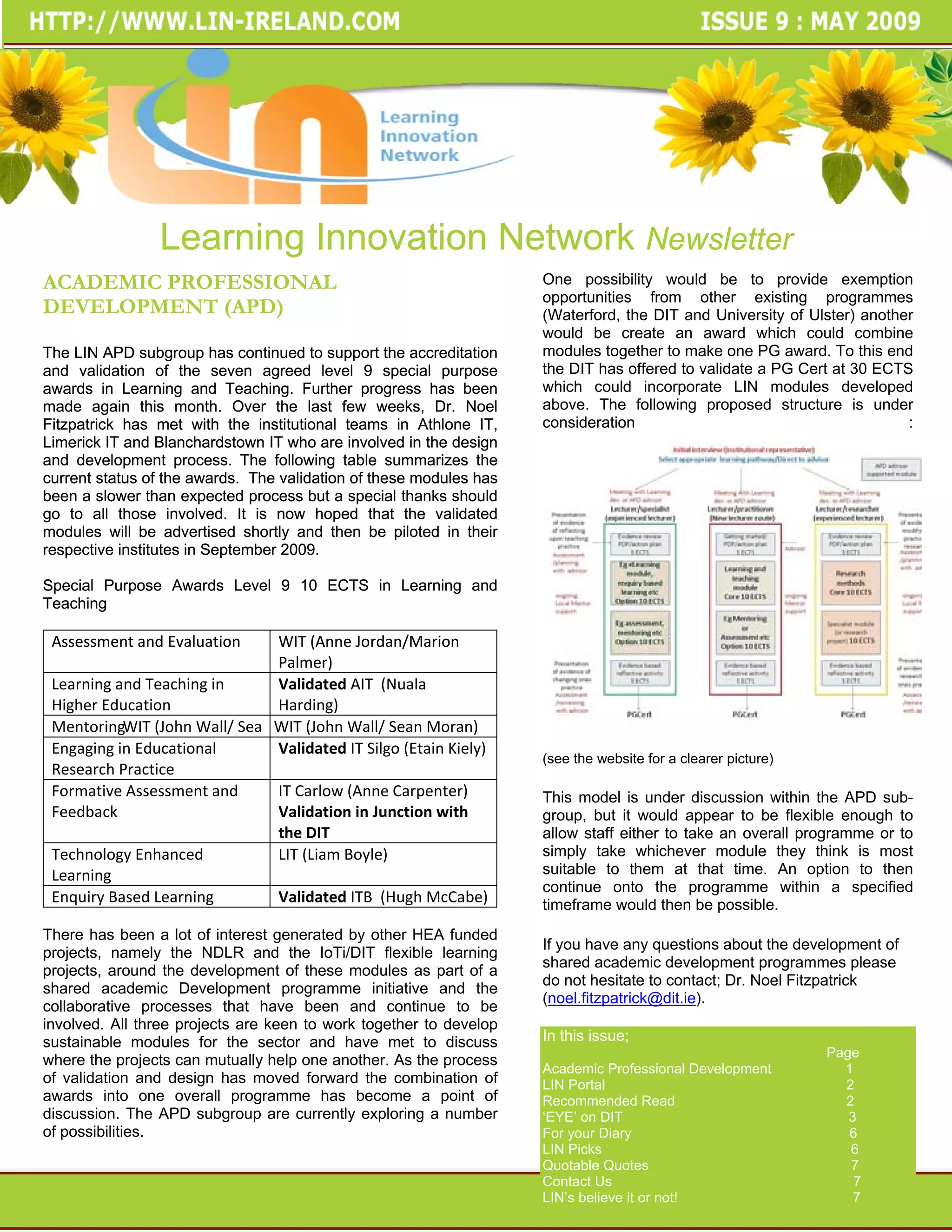 The document discusses academic professional development at the Learning Innovation Network (LIN). It provides an update on the validation process of seven special purpose awards in learning and teaching at level 9. It discusses the development of these awards into a shared academic development programme between various higher education institutions. It also provides contact information for questions about the development of these shared programmes.