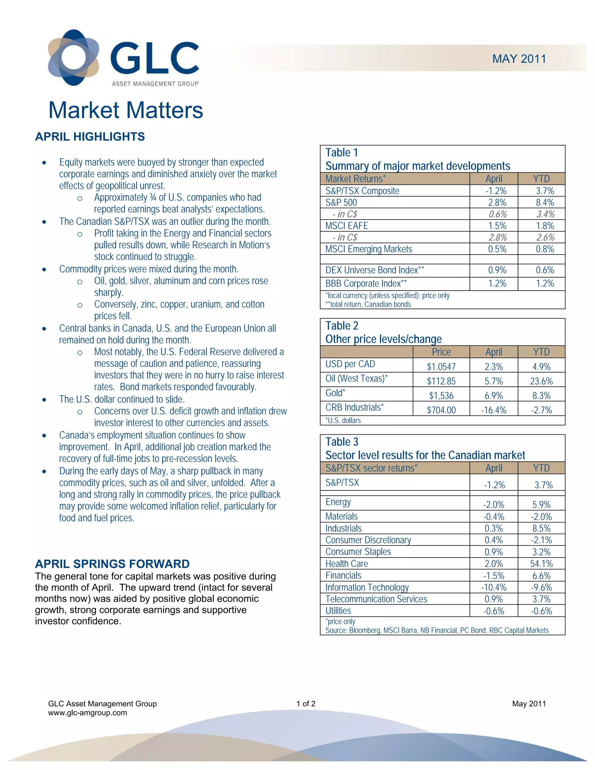 - Equity markets rose in April due to strong corporate earnings and reduced geopolitical tensions. The S&P 500 gained 2.8% while the Canadian S&P/TSX fell 1.2% partly due to declines in energy and financial stocks.