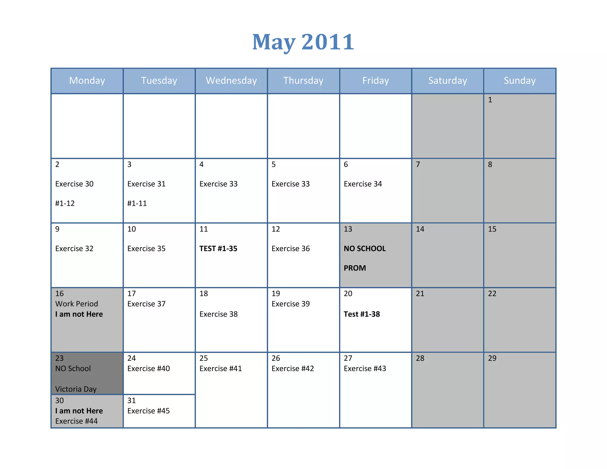 The document contains a schedule for May and June 2011, listing exercises, tests, and exams for different days of the week. It includes Exercise #1-35 on May 11th, a test on May 12th, no school on May 13th for prom, and Victoria Day on May 23rd with no school. The June schedule focuses on provincial exam review from June 6th to 10th, with the provincial exam taking place from 8:45-12:00 on June 16th in the library.