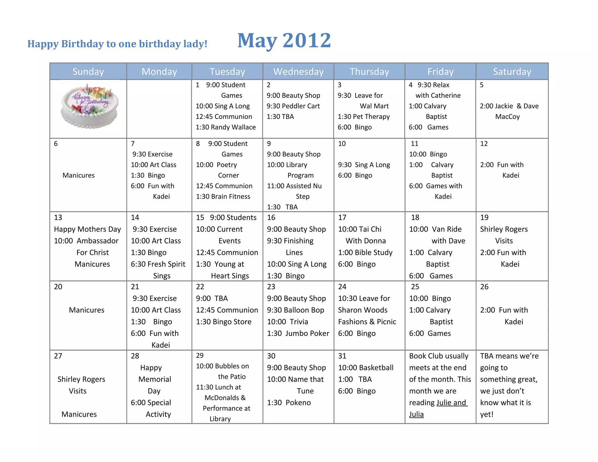 This document contains the schedule for a woman's birthday month of May. It lists her planned daily activities, events, and outings for each day. These include things like student games, trips to the beauty shop, library programs, bingo, church services, and visiting with friends. The schedule shows she has a busy month planned with social activities every day to celebrate her birthday.
