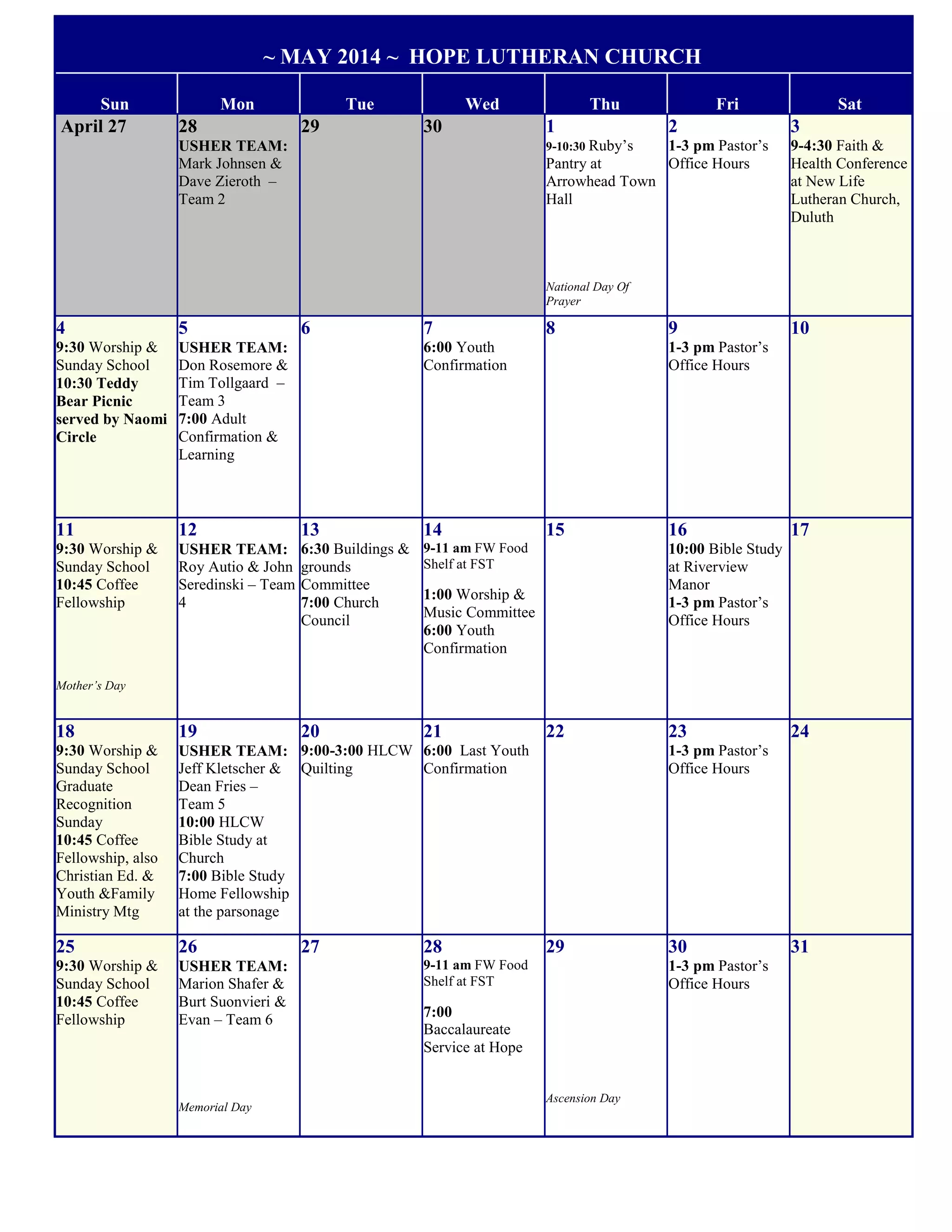 The document is a schedule for Hope Lutheran Church outlining activities and events from late April to May 2014. It includes regular services, committee meetings, youth confirmations, and special events like Mother's Day and Memorial Day. Key details such as usher teams, Bible studies, and fellowship gatherings are also listed.