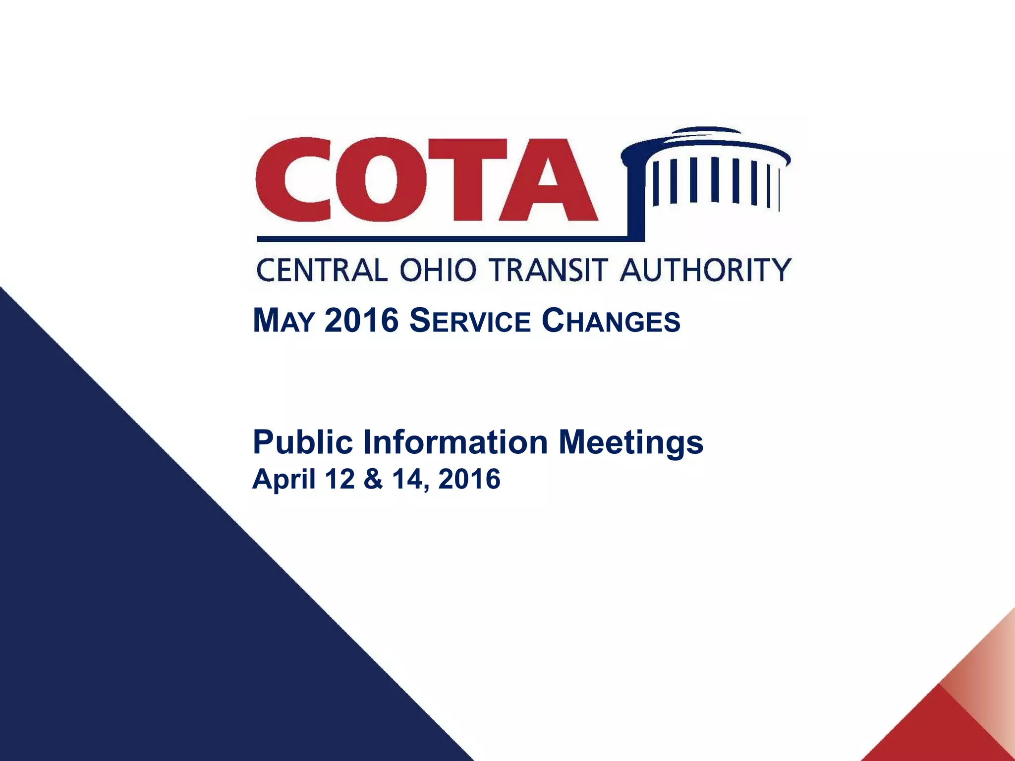 The document outlines the public information meetings held to discuss upcoming service changes by COTA, effective May 2, 2016. It details adjustments to travel times for various bus lines to enhance on-time service, the introduction of new and improved services, and the impact of temporary construction on specific routes. Additionally, it highlights future initiatives like the CMAX Cleveland Avenue BRT and the NextGen project for visioning transit developments through 2025 and beyond.