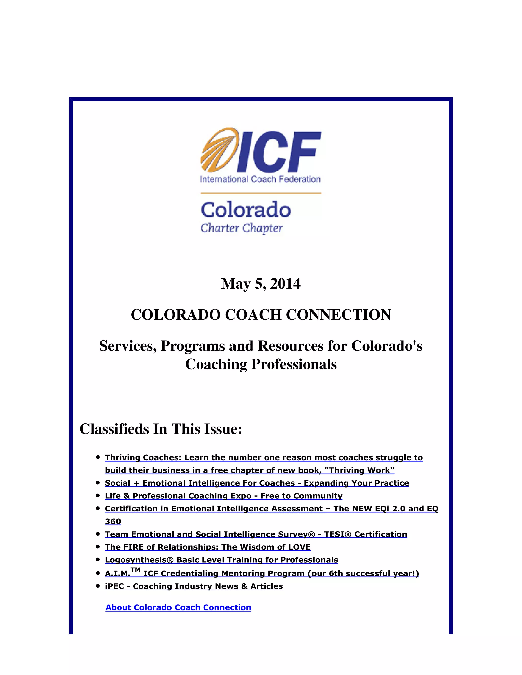 This issue of the Colorado Coach Connection newsletter provides information on various coaching-related services, programs, resources and events happening in Colorado. Notable listings include: