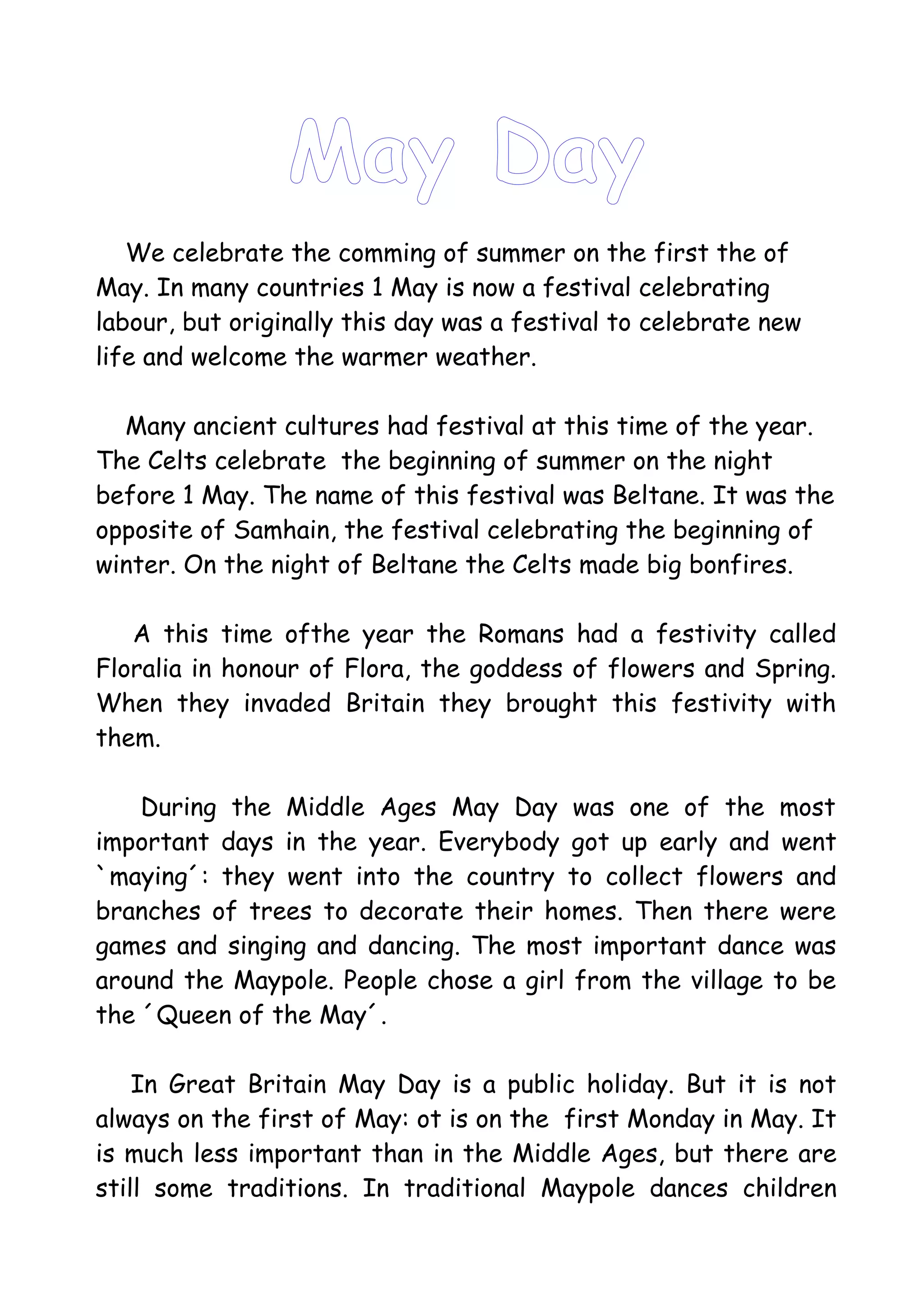 May Day is celebrated on May 1st in many countries as a festival of labor, but originally it was a festival of new life and warmer weather celebrated by ancient cultures. During the Middle Ages, May Day was one of the most important days of the year where people would go "maying" by collecting flowers and decorating their homes with branches before games, singing, dancing, and dancing around the Maypole while choosing a May Queen. Some traditions like Maypole dances and Morris dancing continue on May Day in Great Britain today to symbolize the sun's rays and wake up the earth after winter.