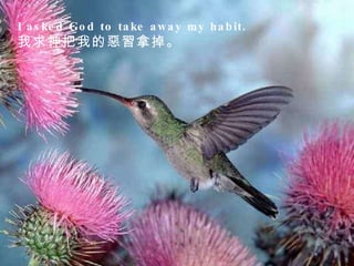 This document contains a series of exchanges where a person asks God for things and God's response is always "No". God explains that it is up to the individual, not God, to give up habits or grow in patience and spirit. God gives blessings but not direct happiness, and allows suffering to draw people closer. God will not directly intervene but will help people to grow and be fruitful on their own. The document encourages cherishing each day and finding meaning in helping others as God helps us.