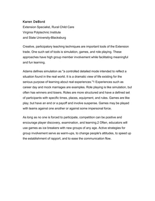Simulation, games, and role playing are effective teaching tools that involve participants and facilitate meaningful learning. These techniques create controlled scenarios that model real-world situations. Role playing is similar to simulation but often includes winners and losers. Games also involve elements of competition but with a defined end goal. These active learning strategies encourage discovery and examination of concepts while building rapport among participants.