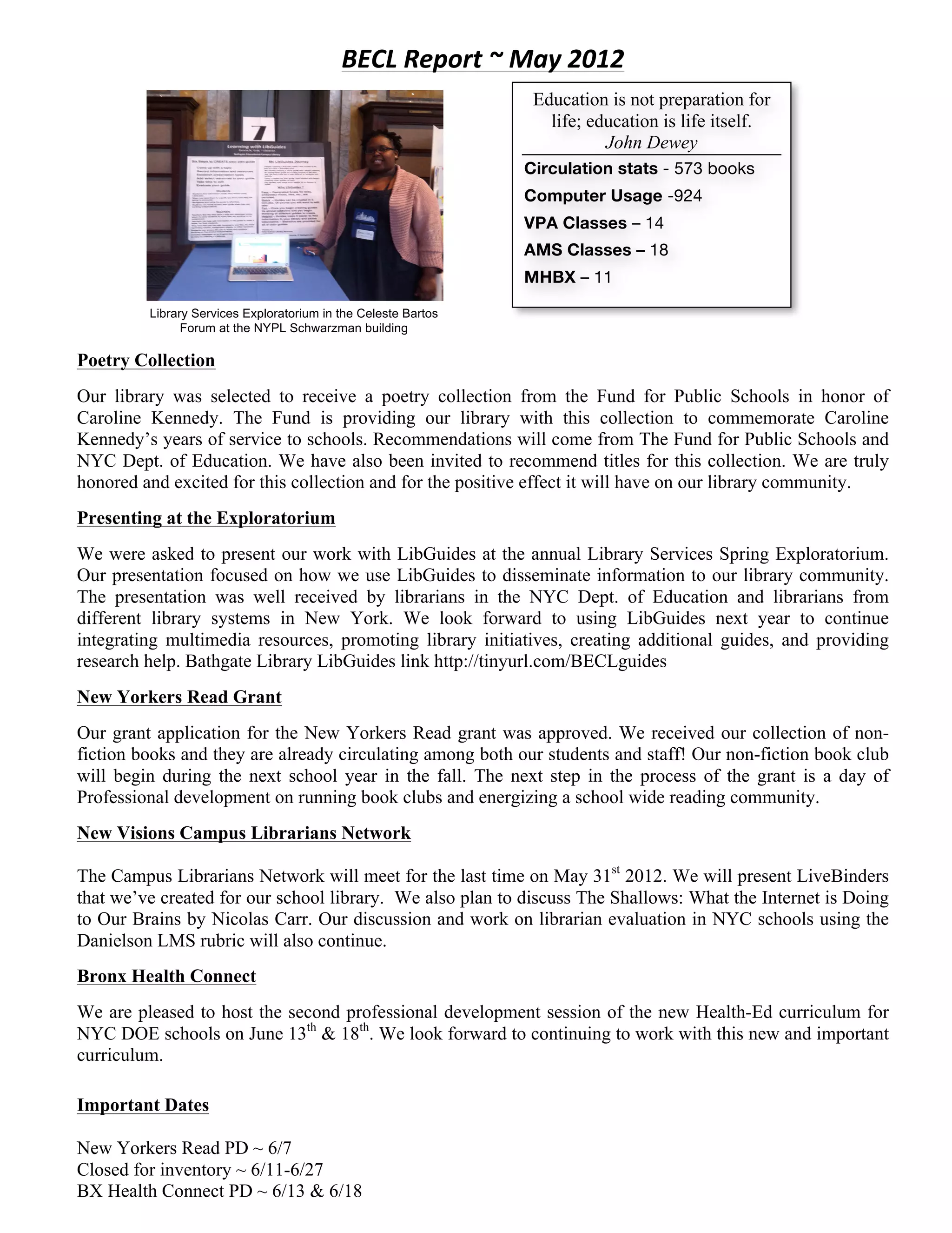 This document provides a summary of activities at the BECL library from May 2012. It notes that the library circulated 573 books and had 924 computer usages in the month. It also highlights that the library received a poetry collection from the Fund for Public Schools in honor of Caroline Kennedy and was asked to present on its use of LibGuides at an exploratorium. The library was also approved for a New Yorkers Read grant to receive a non-fiction collection and will begin a book club in the fall. Important upcoming dates are listed at the end.