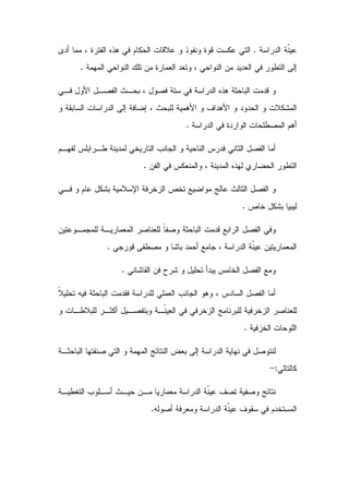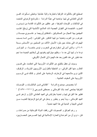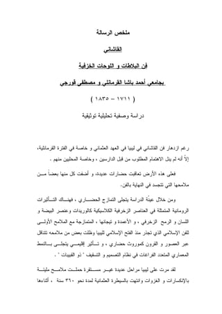 This study analyzes the tiles and tile panels at two mosques in Libya from the Ottoman era. It finds influences from various civilizations, including Roman decorative motifs that were integrated into Islamic art. The tiles also show influences from the Ottoman Empire as well as Tunisia and Morocco. The study examines the tiles and ornamentation across six chapters, analyzing architectural elements, tile art, and ornamental works at the two mosques. It describes the results as documenting the introduction of tiles to Libya and providing both architectural and artistic analyses of design elements at the sites.