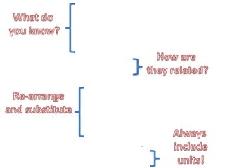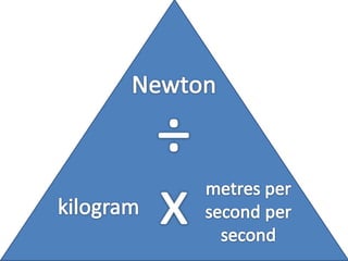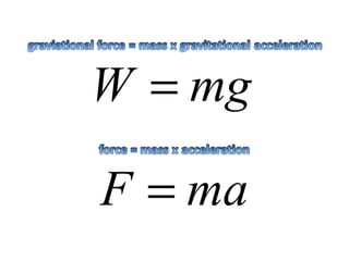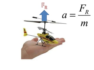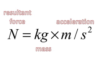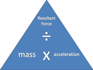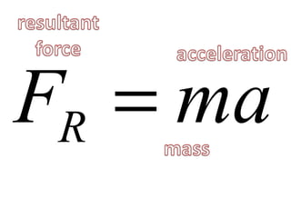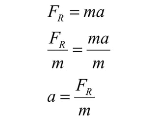 This document discusses forces, mass, and acceleration. It provides examples of calculating acceleration using the equation F=ma. It includes sample problems such as determining the force needed to accelerate a space shuttle or the acceleration of a cyclist pedaling with a given force. Practice problems are provided for students to calculate acceleration, force, or mass given two of the three variables.