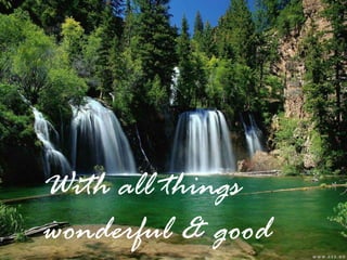 This poem wishes the recipient blessings of joy, victories, strength in struggles, beauty, order, abundance, guidance towards goodness, trust in God, light in darkness, love, protection, wisdom from hurts, triumph over trials, living abundantly, and blessing others. It encourages letting love and joy flow freely, giving freely, remembering our oneness, and judging not. Overall it conveys heartfelt wishes for a blessed and loving life.