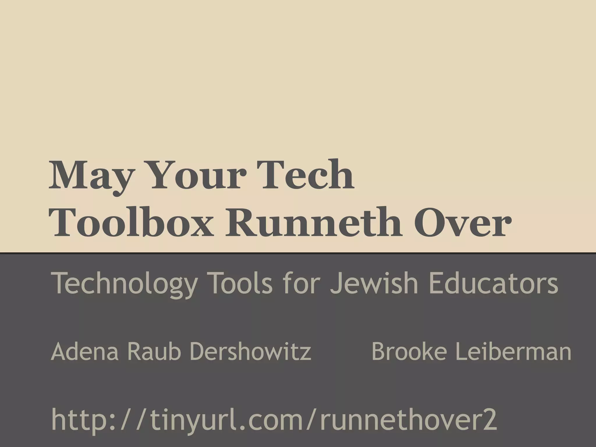 This document discusses using technology tools in Jewish education. It begins by explaining that technology is important because students are immersed in technology and it can extend learning time and foster higher-order thinking. Some concerns with technology are discussed, such as constant change and control issues. The document then explores various free web tools in categories like blended learning, classroom engagement, and student creations. These tools include Glogster for online posters, ToonDoo for comic strips, and Screenr for screen capturing. The document concludes by providing additional resources and contact information for the authors.