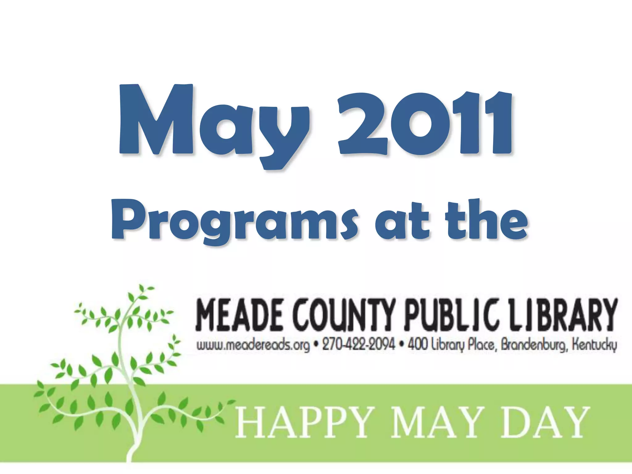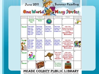 The document provides information about various programs being offered at the Meade County Public Library in May 2011, including summer reading programs for children from June 6-16 with weekly sessions for different age groups, special summer reading events at David T. Wilson Elementary with no registration required, regular storytimes for toddlers and preschoolers, a family movie night, cooking competitions for teens, yoga classes on Wednesdays and Beginner's Yoga on Wednesdays, family history writing classes on Thursdays, book discussions on May 3rd and 19th, paper craft classes on Thursdays in May, and a basket weaving class on May 25th.