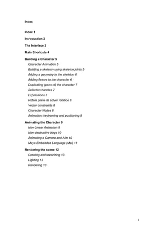 This document provides a beginner's guide for animating a character in Autodesk Maya. It discusses building a character by creating a skeleton with joints, adding geometry, and binding them. It also covers adding controls like IK handles and flexors. The guide explains how to prepare the character for animation through techniques like expressions, constraints, and character nodes. It then discusses animating the character through keyframing, non-linear animation, and the Trax editor. Finally, it briefly touches on animating cameras, lighting, texturing, and rendering the scene.