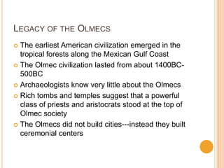 The document discusses the Olmec and Maya civilizations, detailing the Olmecs as the earliest known American civilization with a focus on their religious practices and significant contributions like carved stone heads and a writing system. The Maya civilization flourished later, characterized by advanced farming techniques, impressive architecture, and a rich cultural life, including a complex calendar and hieroglyphic writing. Both civilizations left a legacy that influenced later societies in Middle America, though the reasons for the eventual decline of the Maya around 900 AD remain uncertain.
