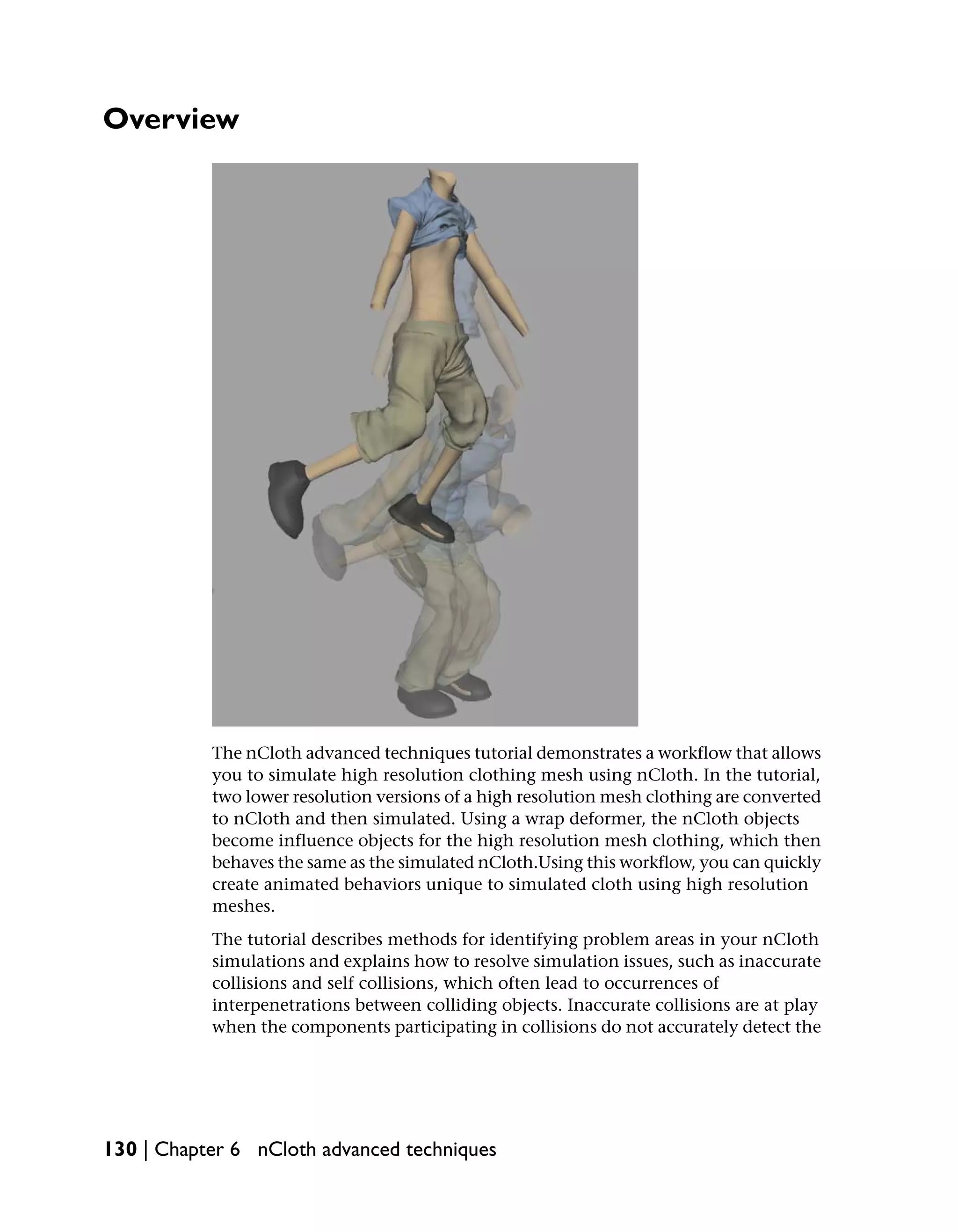 The tutorial demonstrates how to simulate high resolution clothing meshes using nCloth. It covers converting lower resolution meshes to nCloth, setting them up as influence objects for a high resolution wrap deformer. It also describes identifying and resolving simulation issues like inaccurate collisions. Key steps include converting a low resolution pants mesh to nCloth, setting the Nucleus solver attributes, converting a body mesh to a passive collider, and constraining the pants with a point constraint to simulate them in a static stance.