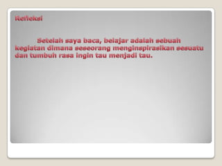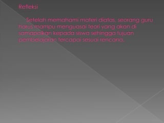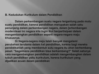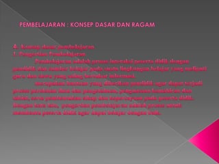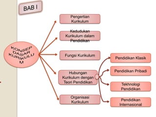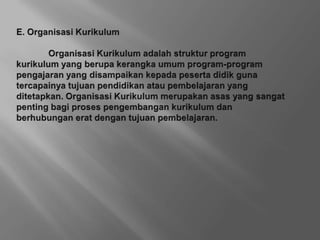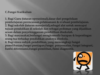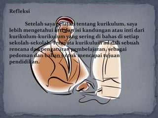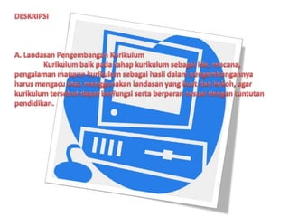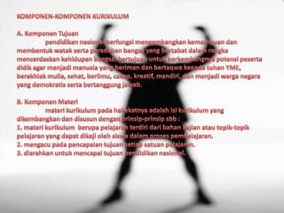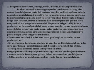 Dokumen tersebut membahas tentang konsep kurikulum dan proses pembelajaran, termasuk pengertian kurikulum, prinsip-prinsip pengembangan kurikulum, komponen-komponen kurikulum, pendekatan, strategi, metode, dan sumber pembelajaran."