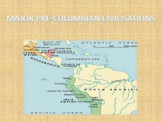 The Mesoamerican civilization of the Maya developed highly advanced cities, writing, calendars, and mathematical and astronomical systems. They built grand temple-pyramids and palaces in cities like Tikal, Palenque, and Chichen Itza between 250-900 CE. The Maya had a complex pantheon of gods and engaged in human sacrifice. Their advanced calendars and hieroglyphic writing declined after severe droughts in the 9th century led to warfare and abandonment of the major cities.