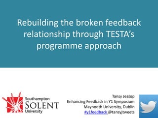 The document summarizes the TESTA methodology for improving feedback and assessment in higher education programs. The key issues identified are: (1) modular course designs make feedback less effective by separating assignments and squeezing out formative tasks, (2) the missing relational dimension of anonymous marking in mass higher education, and (3) TESTA program strategies aim to address these by rebalancing formative/summative assessment, using peer/audio/blog feedback, and shifting from a transmission to social constructivist educational model.