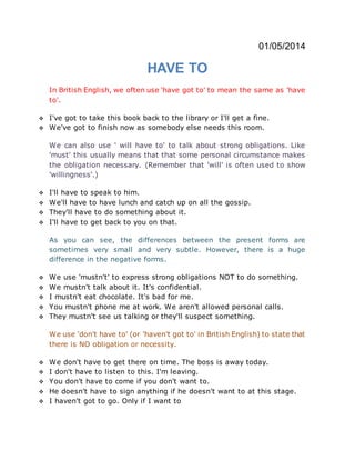 The document discusses the use of "have to" and related expressions in different contexts and tenses. It explains that "have to" expresses obligation or necessity, while "don't have to" means there is no obligation. In the past, "had to" is used instead of "have to" to talk about past obligations. Similarly, "will have to" refers to future obligations. The negative forms of obligation are also discussed. Examples are provided to illustrate the appropriate uses of "have to", "don't have to", "had to", "will have to", and related expressions in different situations.