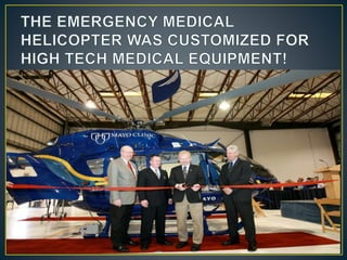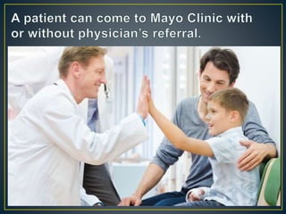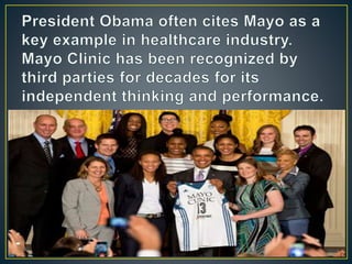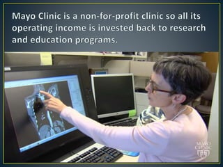 Mayo Clinic is the largest integrated not-for-profit medical group founded over 100 years ago in Rochester. It provides exceptional healthcare across many specialties and leads in fields like cancer, heart disease, and respiratory disorders. Mayo Clinic is ranked the #1 hospital in the US and top 10 in most medical specialties. It prioritizes patient needs, conducts medical research, and operates a medical and graduate school to advance healthcare.