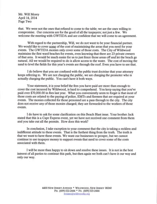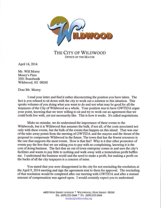 Wildwood Mayor Ernie Troiano's response to Will Morey's letter about moving beach events.