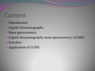 Liquid chromatography-mass spectrometry (LC-MS) is an analytical technique that combines liquid chromatography with mass spectrometry. It has high sensitivity and selectivity. LC-MS is commonly used in pharmacokinetics studies to analyze drugs in biological samples. It is also used in proteomics to identify over 1000 proteins in complex samples like human serum. Additionally, LC-MS has various applications in drug development such as metabolite identification, quantitative bioanalysis, and quality control.
