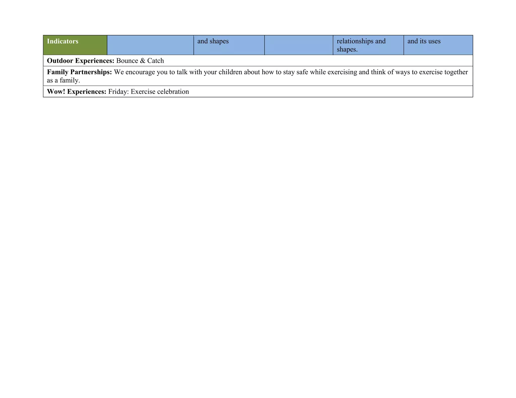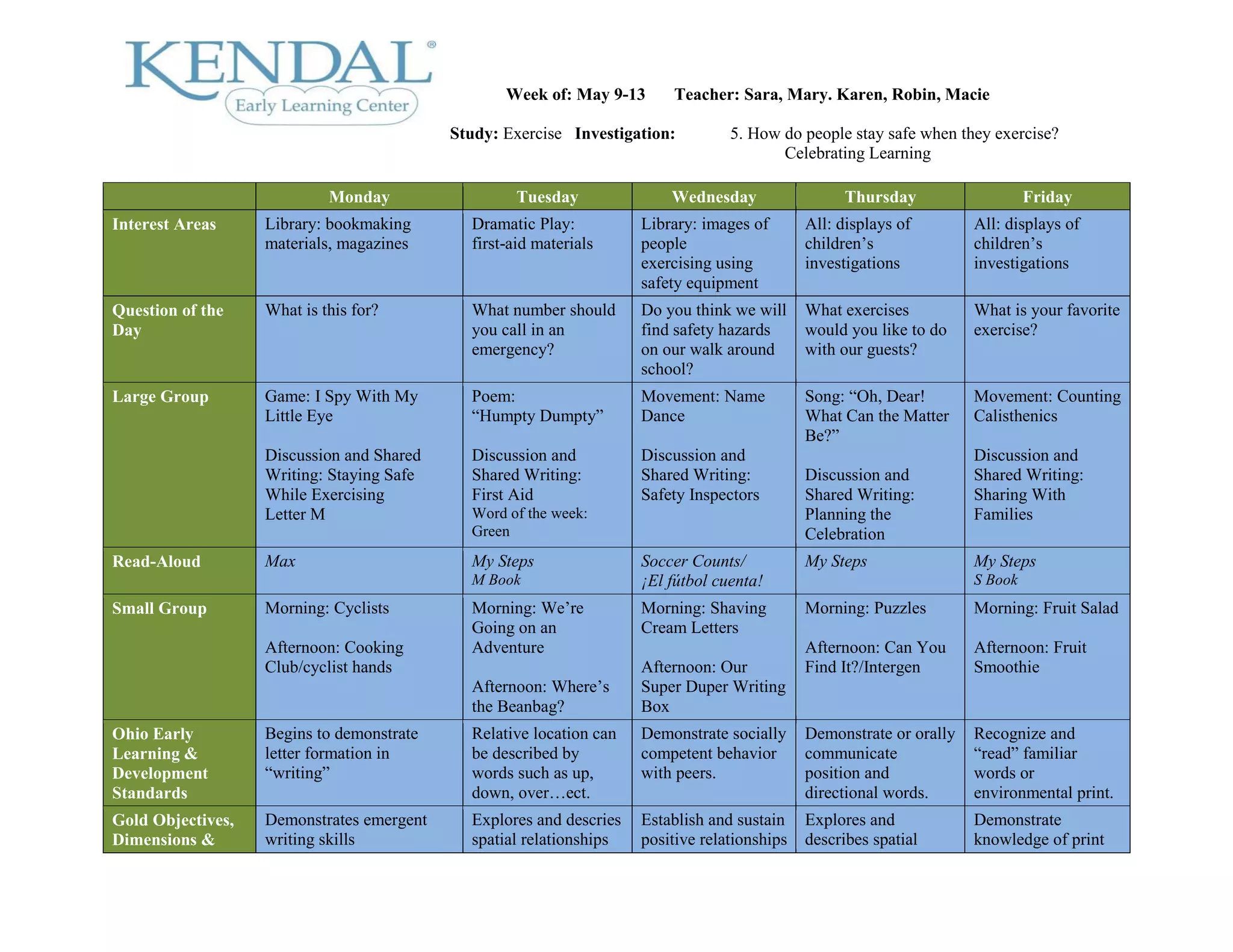 The document outlines the weekly schedule and activities for a preschool classroom, with a focus on an investigation into how people stay safe when exercising. The schedule includes activities exploring safety equipment for different exercises, first aid, and planning a celebration of their learning about exercise safety. The classroom will celebrate their learning about exercise safety on Friday with an exercise celebration.