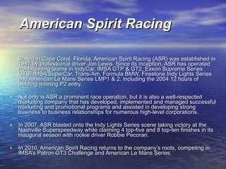 American Spirit Racing (ASR), established in 1987 by Jon Lewis, is a prominent racing and marketing company based in Cape Coral, Florida, with a successful history in various motorsport series including IndyCar and IMSA. In 2010, ASR competes in the IMSA Patron GT3 Challenge and American Le Mans Series, utilizing advanced 2010 Porsche GT3 Cup cars that showcase significant engineering improvements. The team offers full season driver programs with substantial prize incentives and professional support tailored for aspiring racers.