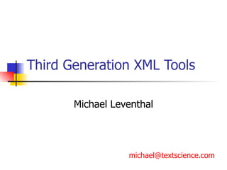 The document discusses the evolution of XML tools, focusing on third-generation tools that enhance programming models and performance, particularly through schema to Java generation. It highlights the simplification of the development process by reducing the need for XML experience while improving type checking and reliability. Performance comparisons of various XML processing approaches, including streaming and DOM, are also provided, demonstrating memory efficiency and execution time.