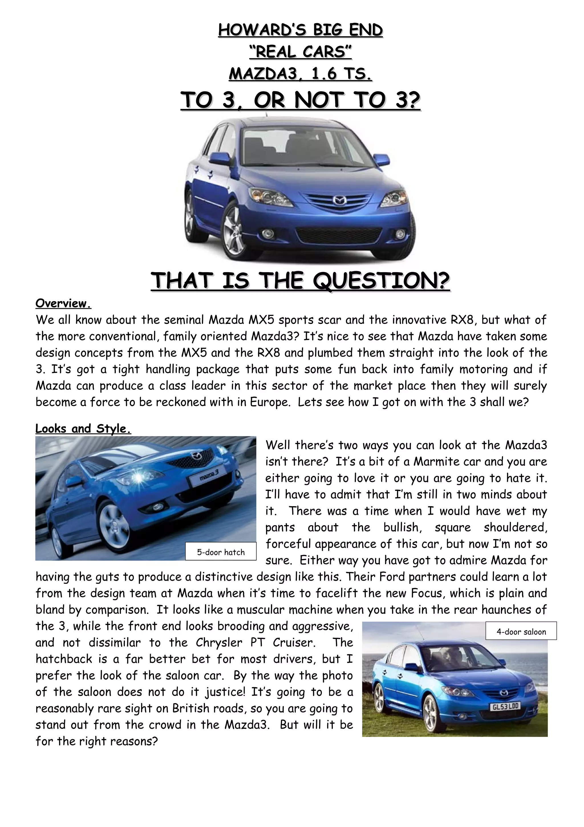 The Mazda3 offers a family-friendly design influenced by the sporty Mazda MX5 and RX8, featuring a distinctive appearance that may divide opinions. It provides a range of engines, with the 1.6 diesel being the most capable, although some models lack power and refinement on the motorway. While the Mazda3 is practical and well-built, it may feel cramped for rear passengers and lacks some standard safety features, making it a solid yet unconventional choice in its competitive class.