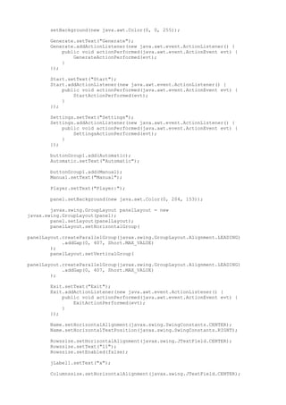 This document contains the Java source code for a maze generation and solving program. It defines a Maze class that extends the JFrame class and contains methods for generating a random maze based on user-specified dimensions, displaying the maze on a graphical panel, and solving the maze automatically using breadth-first search or manually. The main method creates an instance of Maze and makes it visible, launching the GUI.