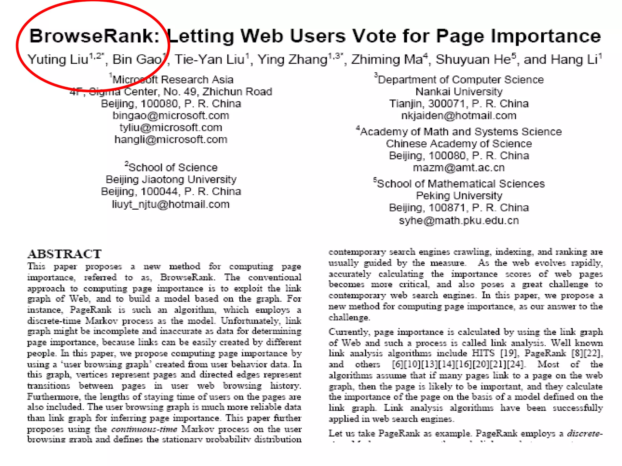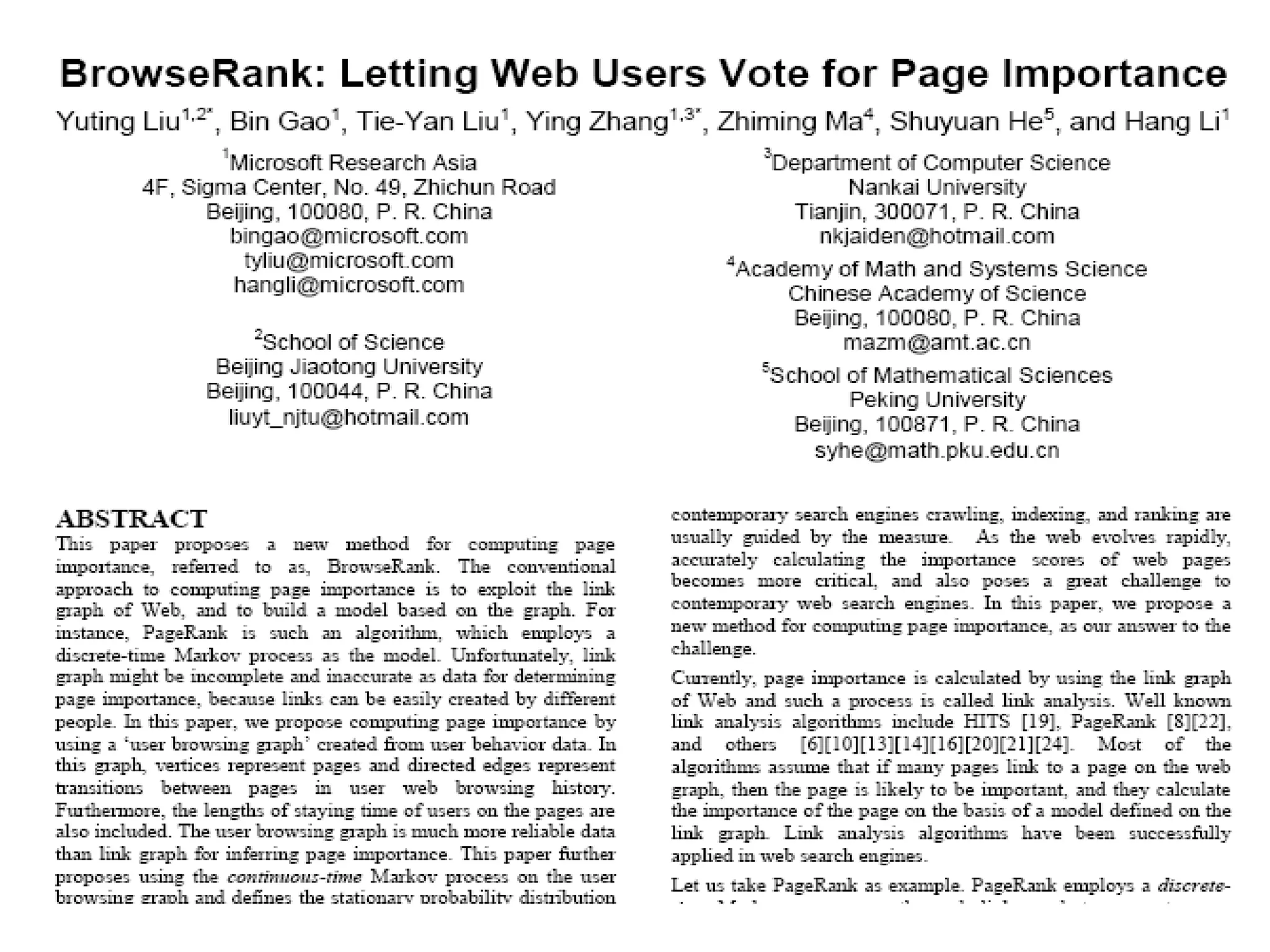 3. It proposes a new ranking algorithm called BrowseRank that models user browsing behavior using Markov chains and takes into account visit duration to better reflect true page importance.