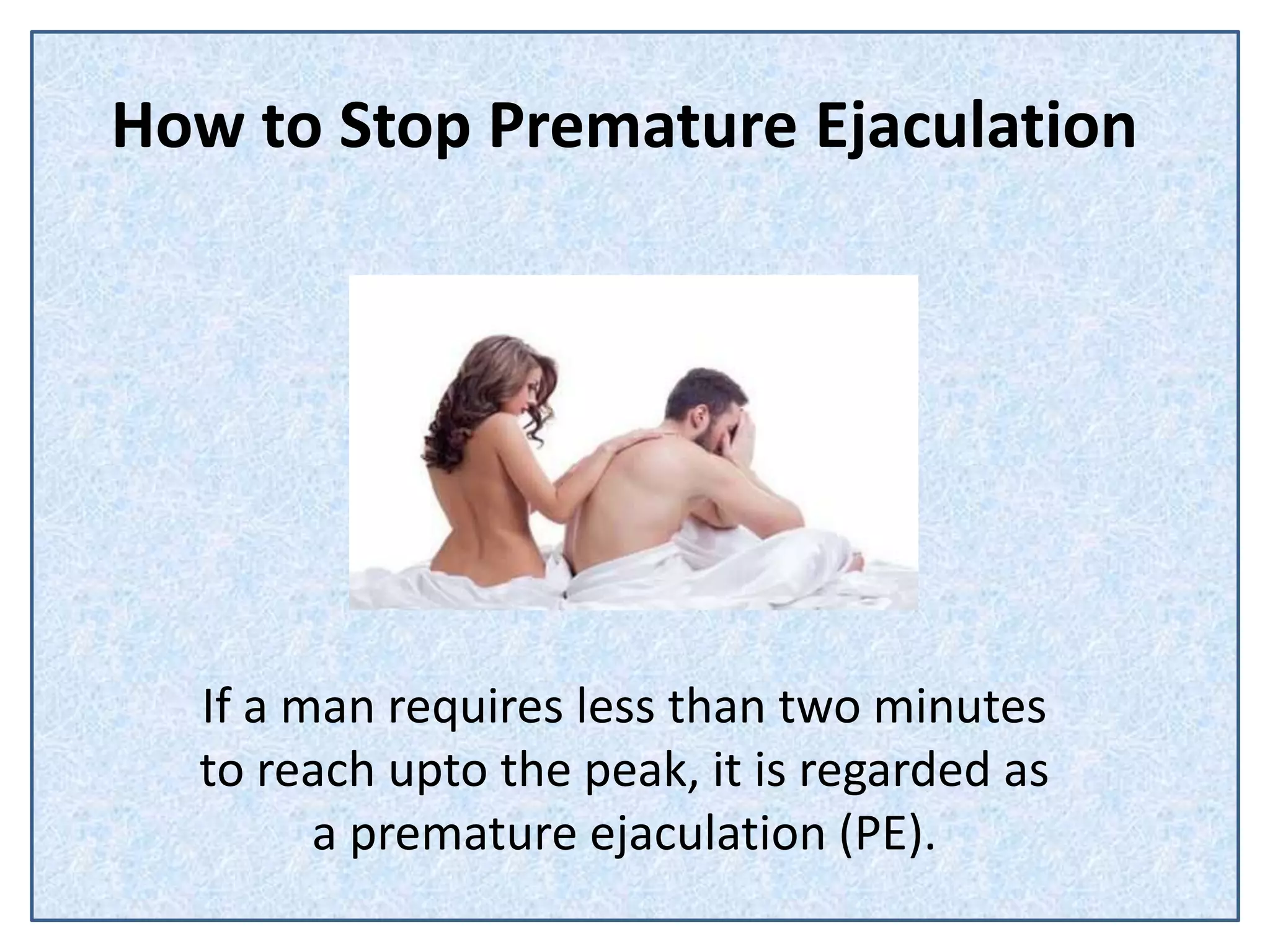 How to StopPremature Ejaculation If a man requires less than two minutes to reach upto the peak, it is regarded as a premature ejaculation (PE).