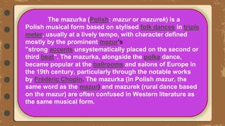 The mazurka is a Polish musical form and dance based on folk dances in triple meter. It became popular in 19th century Europe salons and ballrooms, particularly through the works of Frédéric Chopin. The mazurka spread from Poland to other parts of Europe and Latin America, where local composers incorporated it into their music and adapted it with local folk dance influences. It remains a popular traditional dance form in some countries like the Philippines, Portugal, and Nicaragua where it has been integrated with indigenous musical styles.
