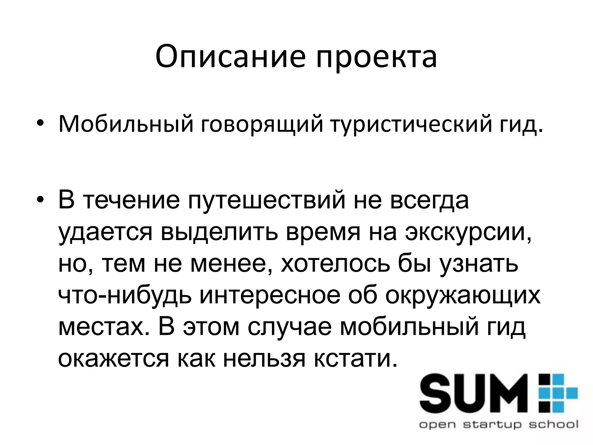 Документ описывает проект мобильного говорящего туристического гида, который предоставляет информацию о местах без необходимости предварительного сбора контента. В отличие от конкурентов, таких как Qwiki, этот гид предлагает эксклюзивную информацию и не зависит от фиксированных маршрутов. Команда проекта состоит из нескольких специалистов, и на данный момент разработан прототип для Windows Mobile.