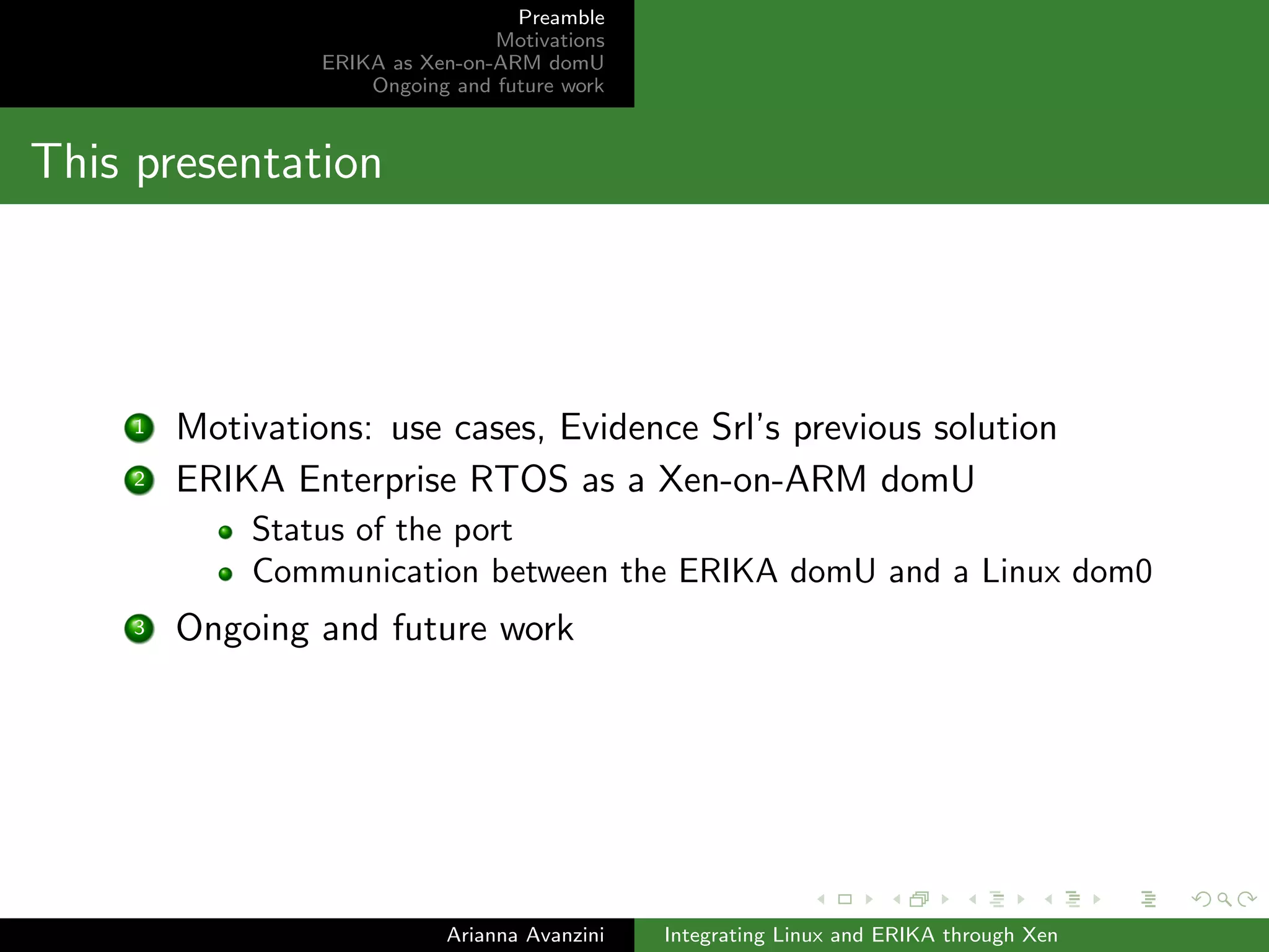 The document discusses integrating the Erika real-time operating system (RTOS) with Linux through the Xen hypervisor, focusing on its application in safety-critical systems like automotive and avionics. It outlines the motivations, ongoing work, and various steps needed to enable efficient inter-domain communication and memory access while ensuring task execution guarantees. The proposed Xen-based approach is examined for its benefits and challenges, including the guarantees of isolation and concerns regarding boot time and certification of the Xen hypervisor.