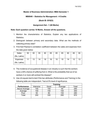 2) An assignment set with 6 questions covering topics like characteristics of statistics, primary and secondary data collection, correlation coefficient, probability, chi-square test, index numbers, and analysis of variance.