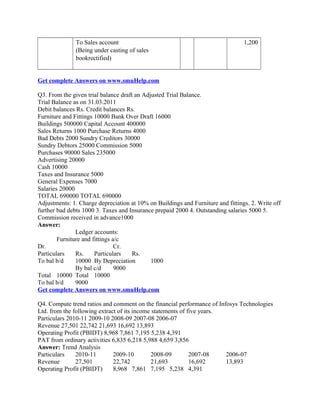 This document contains questions and answers related to accounting topics. Question 1 asks to analyze transactions under the traditional accounting approach. Question 2 provides journal entries for errors detected in a trial balance. Question 3 asks to draft an adjusted trial balance based on given trial balance and adjustments. Question 4 asks to compute trend ratios and comment on the financial performance of a company based on income statement data. Question 5 defines cash flow analysis and its objectives. Question 6 asks about the assumptions of marginal costing and how it differs from absorption costing. The document provides accounting help and guidance on various accounting concepts and calculations.