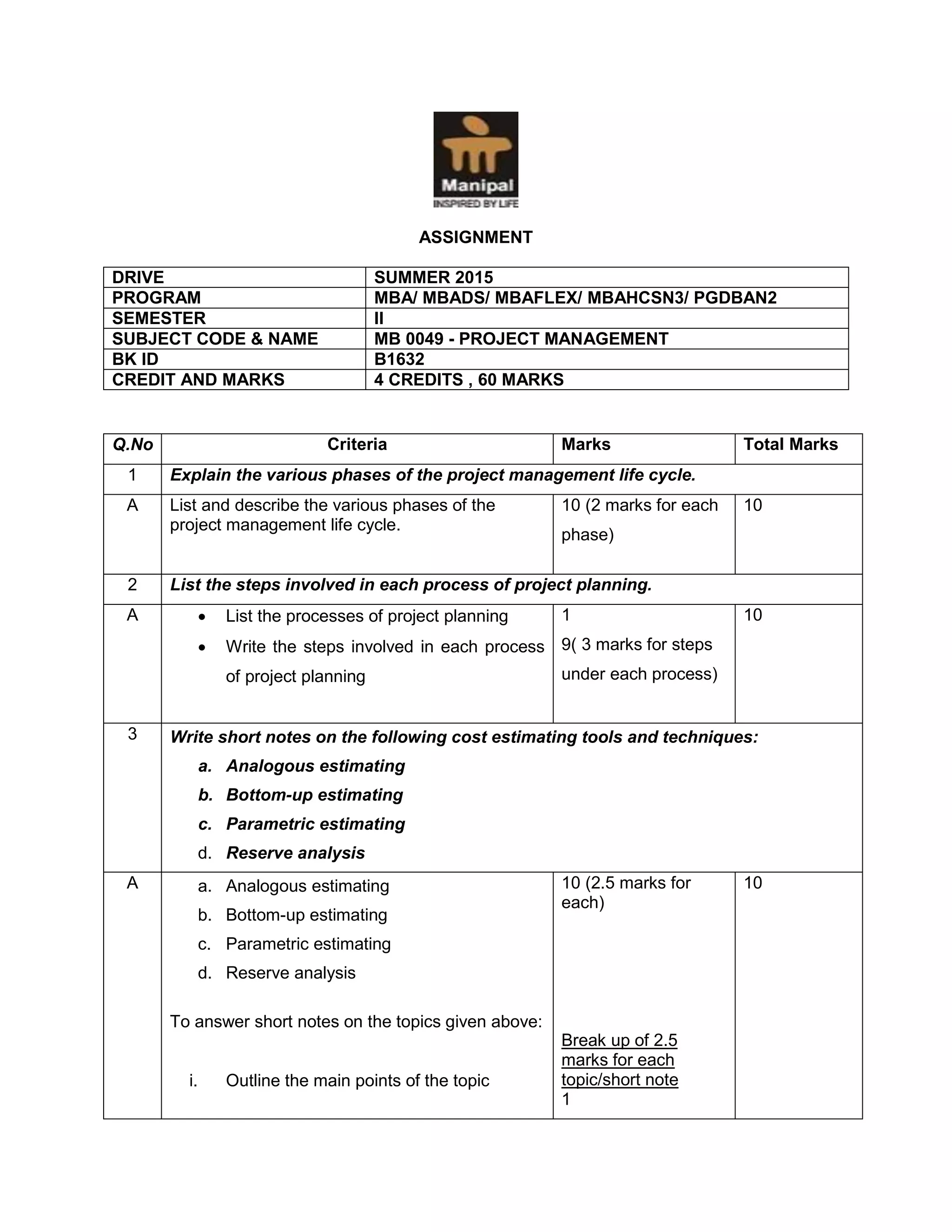The document outlines the structure and requirements for an assignment on project management, including topics such as the project management life cycle, project planning processes, cost estimating tools, quality control, purchase cycle, and project control elements. It specifies grading criteria for each question, the number of marks available, and emphasizes the expected length for responses. Further resources for solved assignments are also provided.