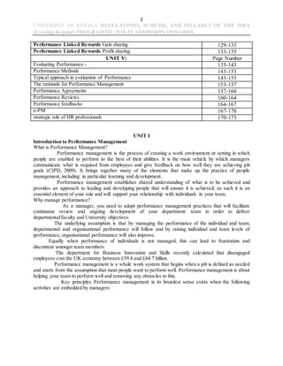 This document discusses performance management in the context of an MBA program. It defines performance management as an ongoing process of setting goals, measuring performance, and providing feedback to improve employee performance and align it with organizational goals. The document outlines the history and evolution of performance management, distinguishing it from traditional performance appraisals. It describes the key elements of performance management, including role definition, goal setting, assessment, feedback, and development planning. The performance management cycle incorporates continuous evaluation and adjustment of goals based on performance.