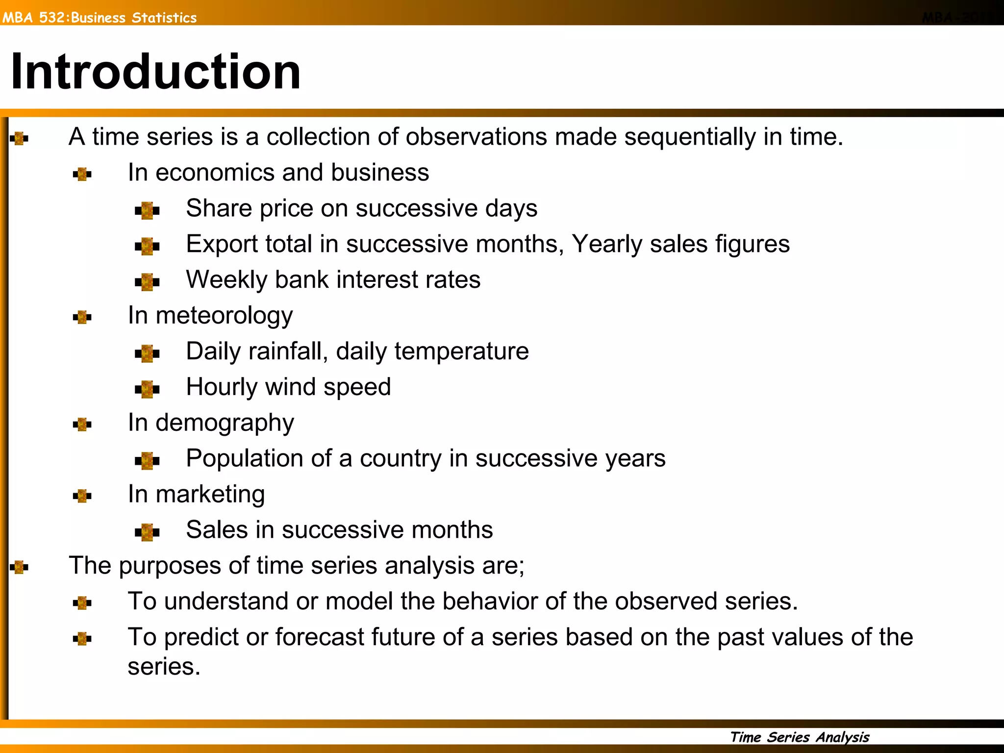 This document provides an overview of time series analysis and forecasting techniques. It discusses key concepts such as stationary and non-stationary time series, additive and multiplicative models, smoothing methods like moving averages and exponential smoothing, autoregressive (AR), moving average (MA) and autoregressive integrated moving average (ARIMA) models. The document uses examples to illustrate how to identify patterns in time series data and select appropriate models for description, explanation and forecasting of time series.