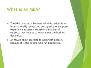 The document discusses different types of MBA programs, including full-time, part-time, executive, distance learning, and flexible MBAs. It provides details on the typical structure and duration of each program, as well as their advantages and disadvantages. For example, it notes that full-time MBAs are typically two years and allow for high interaction, but are also long and expensive. Part-time programs allow students to work while attending school but place strain on studies. The document also provides context on the origins of MBAs and PGDM programs in India.